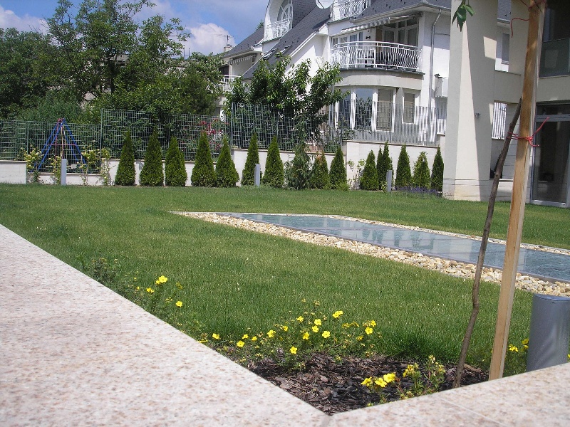 Zöldfelület és kerttervezés. A tervezést geodéziai felmérés és talajvizsgálat előzi meg.